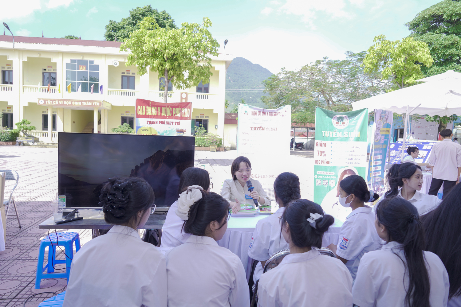 Ngoài ra, gian tư vấn của Trường Cao đẳng Y Dược Phú Thọ còn thu hút đông đảo các em học sinh trực tiếp lắng nghe, tham khảo và đăng ký các ngành học tại gian hàng của Nhà trường. Nhiều em bày tỏ mong muốn được tham quan trực tiếp Trường Cao đẳng Y Dược Phú Thọ để tìm hiểu thêm về môi trường học tập, cơ sở vật chất và các chương trình đào tạo thực tế.