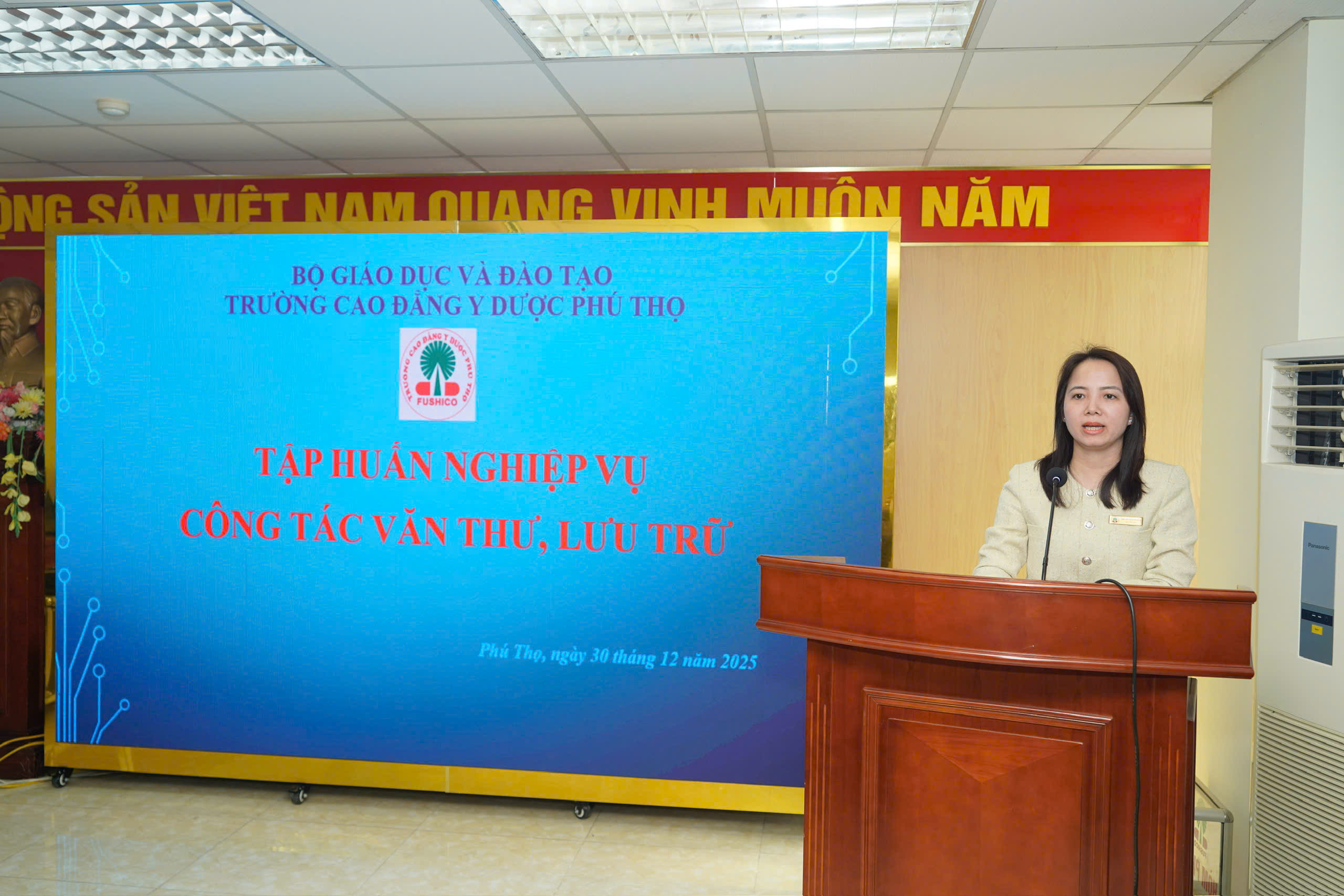 Chiều ngày 30/12/2025, tại Phòng Hội thảo tầng 16, Trường Cao đẳng Y Dược Phú Thọ đã tổ chức buổi tập huấn “Nghiệp vụ cơ bản trong công tác văn thư lưu trữ” dành cho đội ngũ cán bộ, giảng viên Nhà trường. Chương trình do Phòng Tổng hợp chủ trì tổ chức nhằm nâng cao kỹ năng chuyên môn, đồng thời chuẩn hóa quy trình soạn thảo, ban hành và quản lý văn bản, đặc biệt là văn bản điện tử trong bối cảnh chuyển đổi số hiện nay.