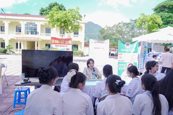 Tại sự kiện, TS. Trần Thị Vân Anh – Phó Hiệu trưởng/Trưởng phòng Đào tạo và Hợp tác Quốc tế Trường Cao đẳng Y Dược Phú Thọ đã trực tiếp tư vấn, định hướng và chia sẻ thông tin tuyển sinh cho học sinh. Bằng phong cách truyền đạt gần gũi, dễ hiểu, cô đã giúp các em học sinh THPT Minh Hòa hiểu rõ hơn: